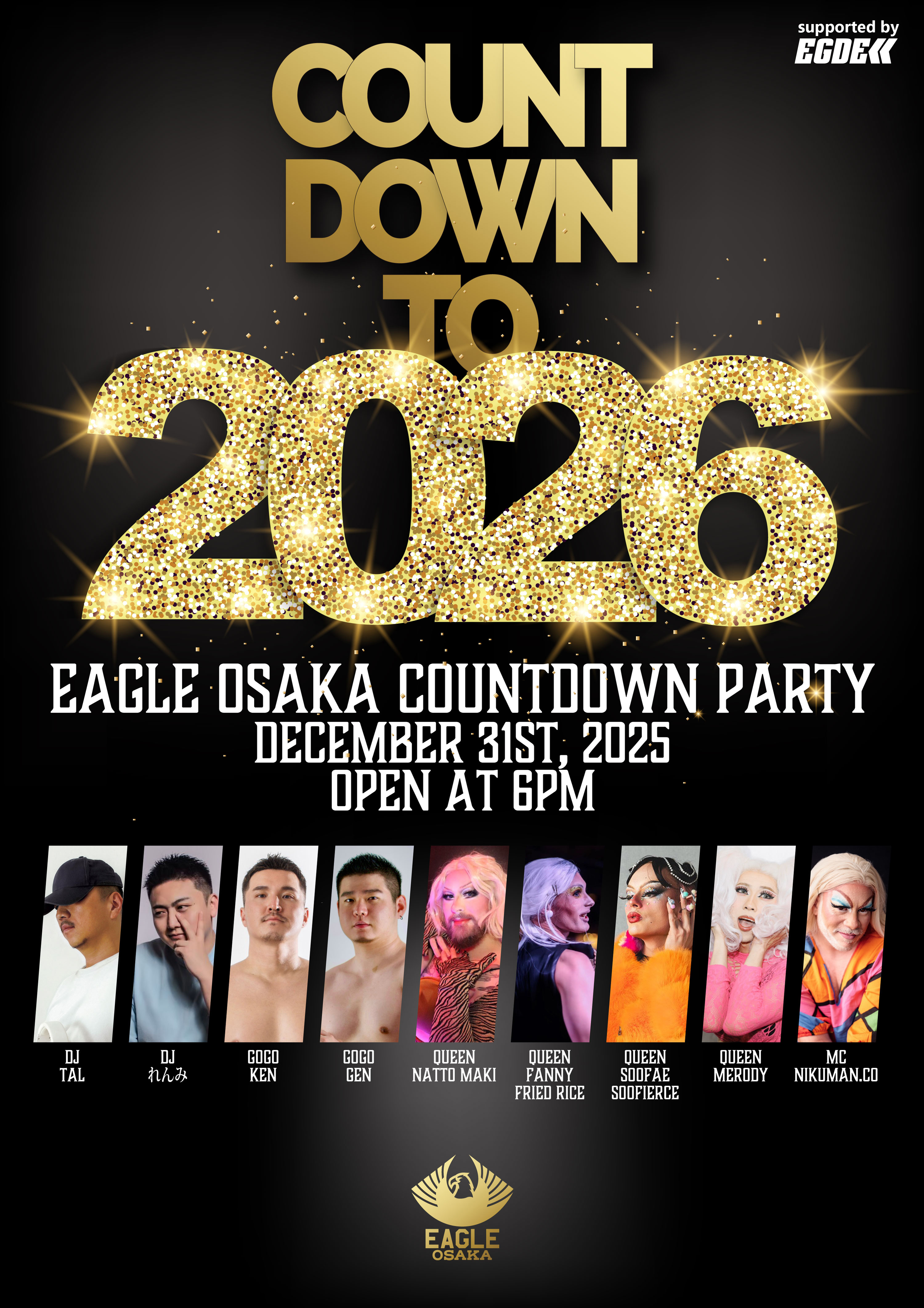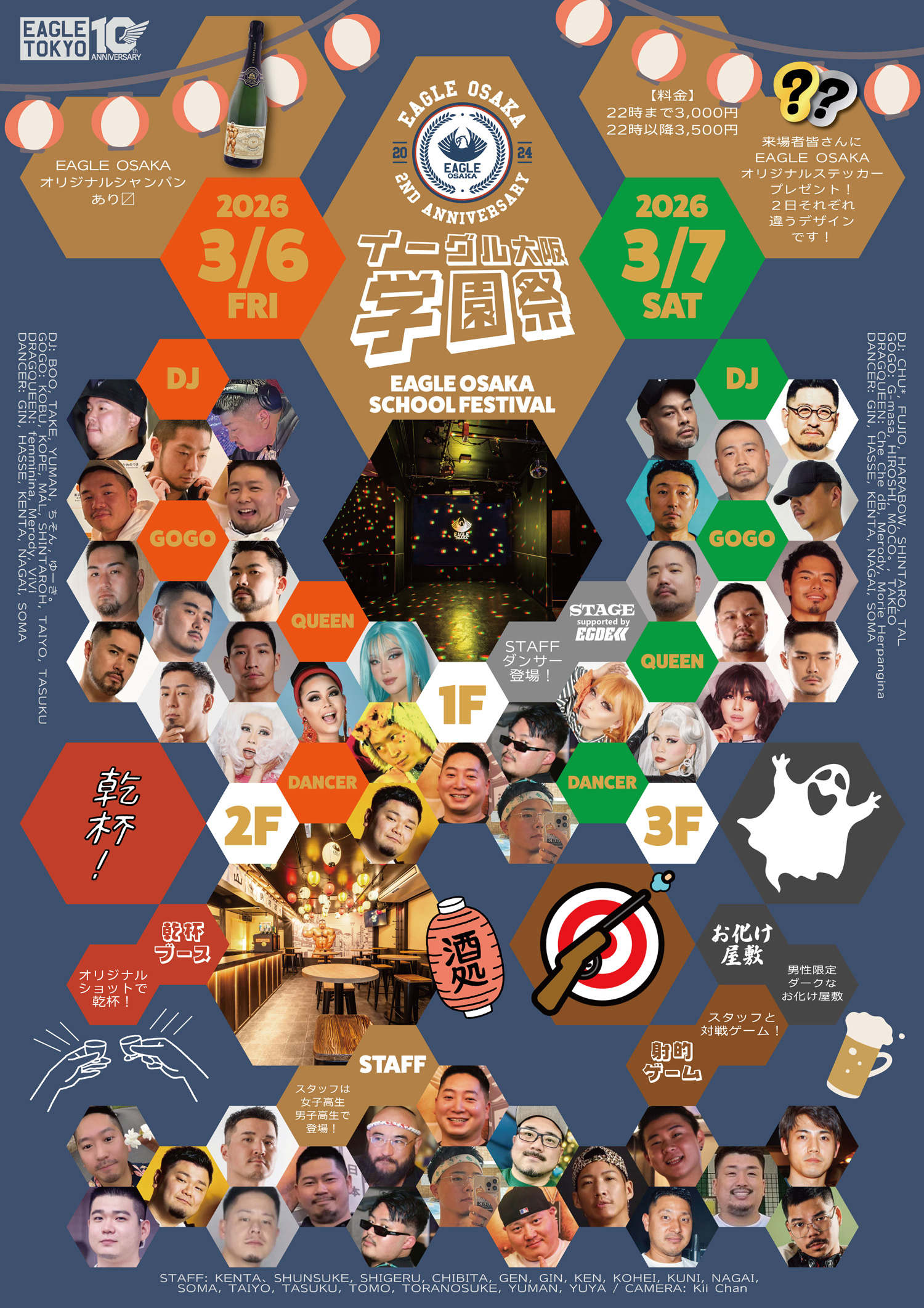 EAGLE OSAKA spread its wings in March 2024, marking the vibrant addition of the third venue to the esteemed EAGLE TOKYO GROUP. Nestled in Doyama-cho, Osaka, it proudly stands as one of western Japan's premier gay bars, offering a dynamic experience for its patrons. Boasting expansive spaces, the first floor hosts exhilarating DJ parties on weekends, while the second floor invites guests to unwind in a Yokocho-style bar, open daily. Complementing the ambiance is Nippondanji, our exclusive gay apparel shop. True to our brand, the second-floor bar features an original Jiraiya mural, echoing the distinctive charm of our Eagle establishments.